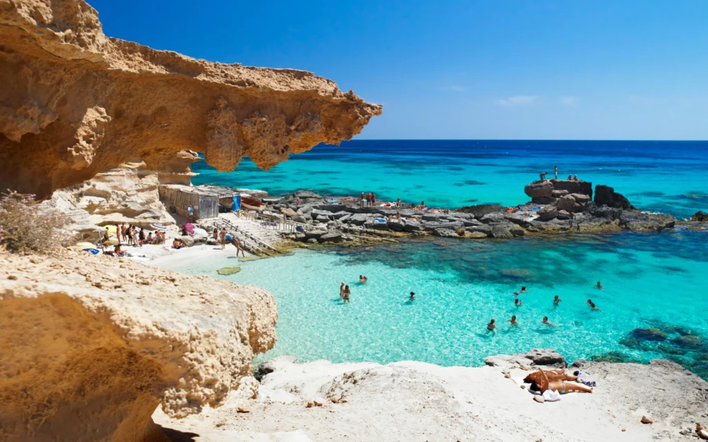 Ibiza is renowned for its stunning and diverse beaches, each offering a unique slice of paradise. Cala Comte (Cala Conta) is one of the island’s most beautiful spots, known for its turquoise waters and breathtaking sunset views. The beach is divided into several small coves, each with its own charm, and offers excellent facilities including beachside restaurants and sunbed rentals. The clear, shallow waters make it a favorite for families and snorkelers alike.